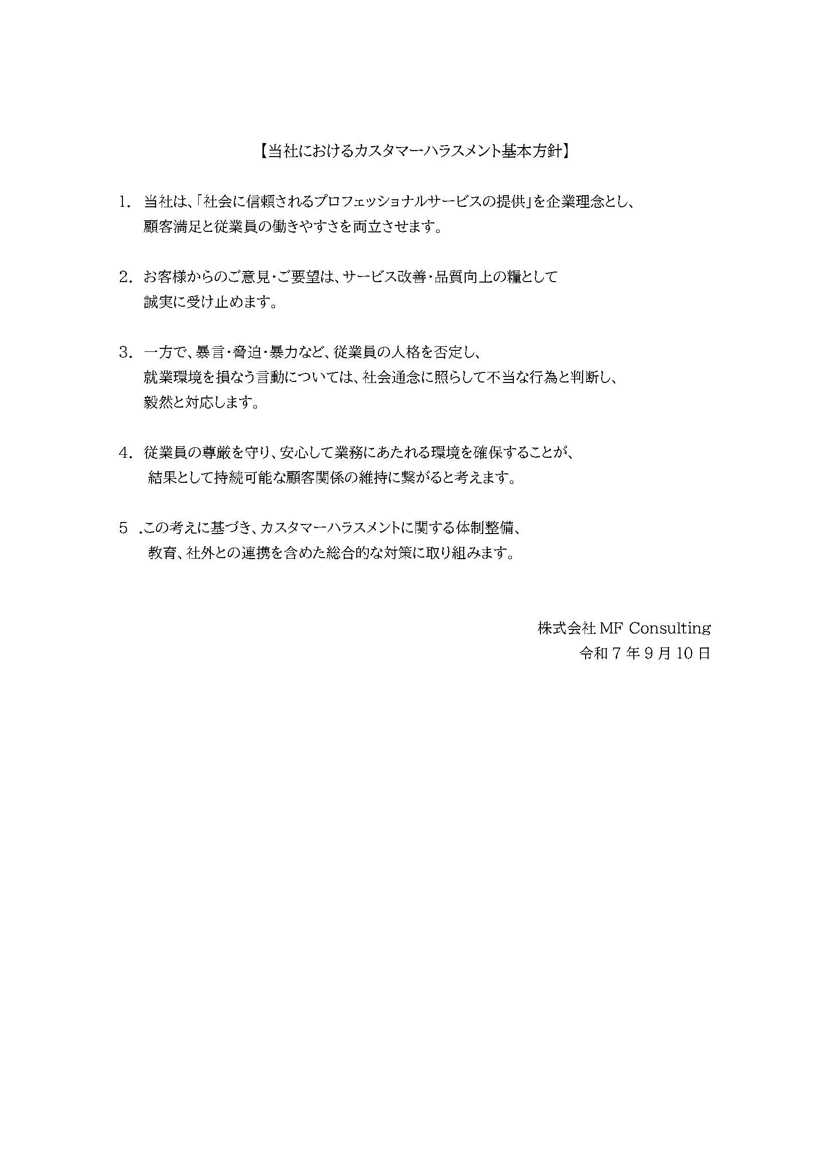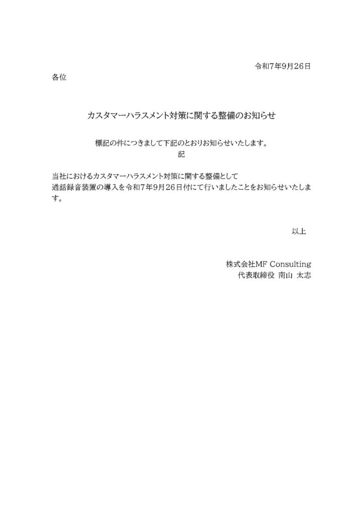 会社概要 会社名 株式会社 MF Consulting (エム・エフ・コンサルティング) 英文社名 MF Consulting Co. Ltd. 代表取締役 南山太志 従業員数 3名 本店所在地 横浜市鶴見区上の宮2-10-2-219 連絡先オフィス横浜市鶴見区上の宮2-10-2-219 事業内容 ・理念浸透コンサルティング®︎・社員動機付け面談代行・会議体系構築・人事評価制度構築・経営顧問
